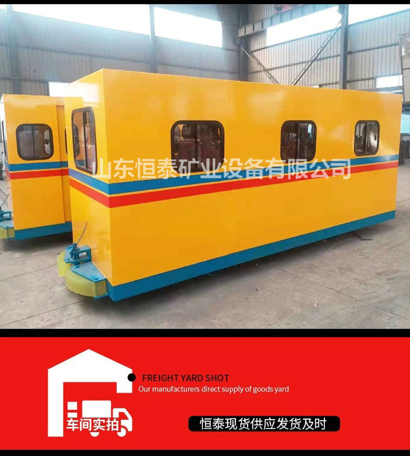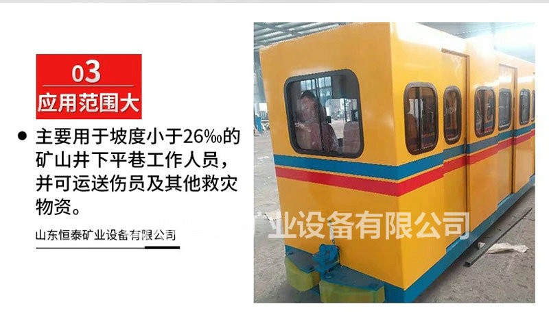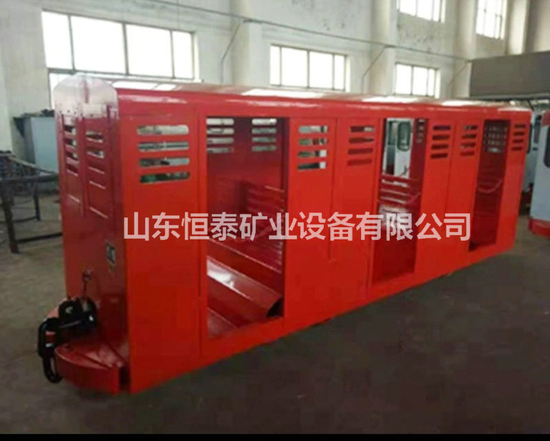 平巷人車主要用于井下運送人員和救護人員,平巷人車包括:車體、椅子、牽引連接頭、車輪、車底架等。平巷人車分PRC6-6/3平巷人車、PRC8-6/3礦用平巷人車、PRC12-6/3平巷人車和PRC18-9/3平巷人車等型號,行駛速度為4米/秒,牽引力為30KN,轉彎半徑8米。車輪固定在車底架下部,車體位于車底架上部,牽引連接頭固定設置在車底架端頭,車體內部兩端分別固定設置一排靠背可以折疊的椅子,在車體內部中間固定設置有兩排靠背可以折疊的背靠背椅子,車體后部設置有后開門,在車體兩側中間位置設置有大推拉門,在大推拉門兩邊位置設置有小推拉門,平時既能運送職工上下班,在出現工傷需要救治傷員時,也可以方便地將擔架抬上并平穩的放置在車體內的座位上。具有乘坐人員和救護傷員的功能。