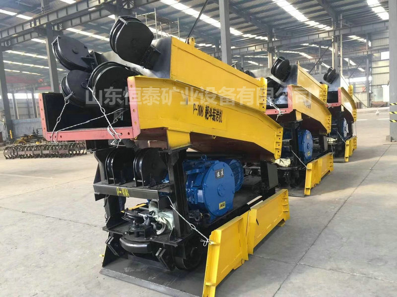 在P-30B耙斗裝巖機的臺車上,安裝有絞車的兩個滾筒,它們在電動機的驅動下,分別牽引著主繩和尾繩,通過主繩和尾繩操縱著耙斗作往復運動,由簸箕口擋板導向,將巖石扒進進料槽內,經過中間槽,在卸載槽尾部的卸料口把礦石卸入下面的礦車之中,如此反復,將礦車裝滿,從而實現裝巖。