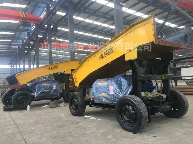 在P-30B耙斗裝巖機的臺車上,安裝有絞車的兩個滾筒,它們在電動機的驅動下,分別牽引著主繩和尾繩,通過主繩和尾繩操縱著耙斗作往復運動,由簸箕口擋板導向,將巖石扒進進料槽內,經過中間槽,在卸載槽尾部的卸料口把礦石卸入下面的礦車之中,如此反復,將礦車裝滿,從而實現裝巖。